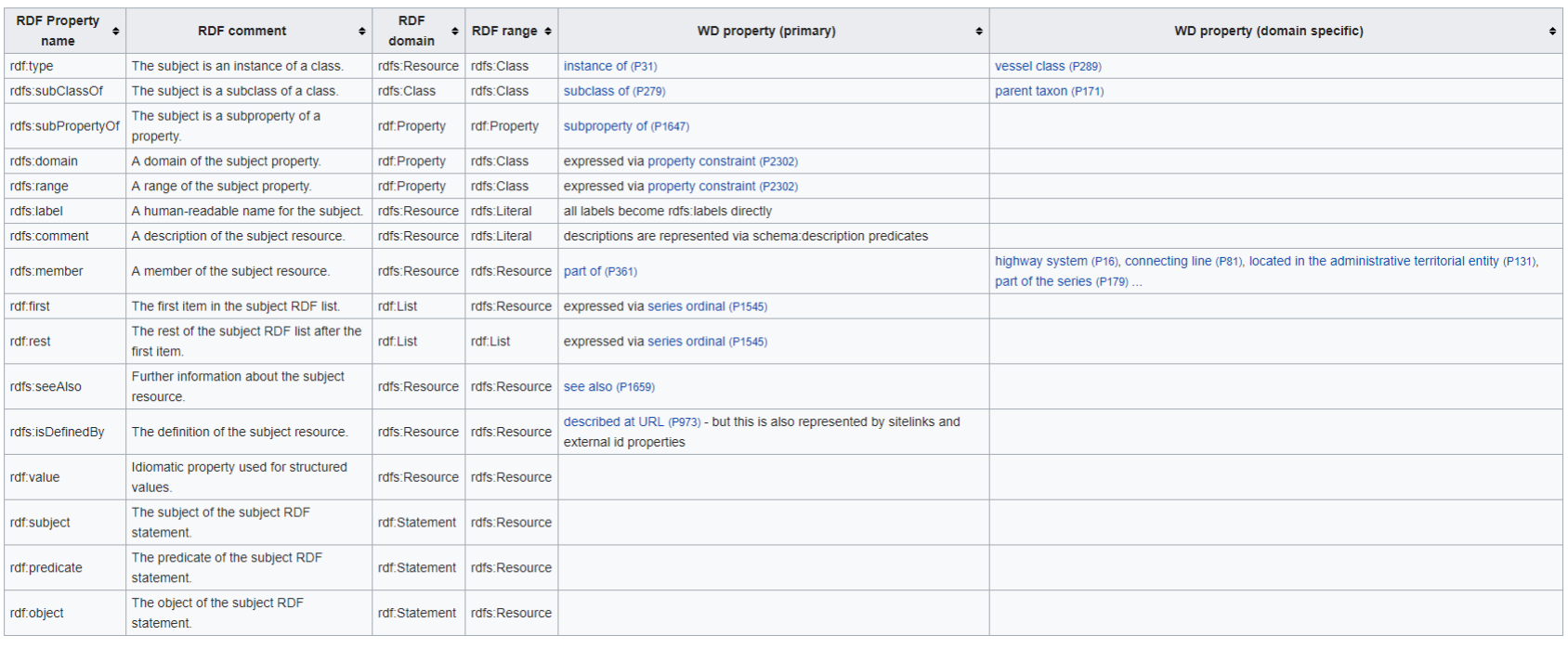 Το μοντέλο δεδομένων Wikidata βρίσκεται στο απλούστερο επίπεδο που ταιριάζει με το RDF, καθώς τα περισσότερα δεδομένα κωδικοποιούνται μέσω ενός στοιχείου (rdf: subject), μιας ιδιότητας (rdf: predicate) και μιας τιμής για αυτήν την ιδιότητα (rdf: object). Ο παρακάτω πίνακας σημειώνει μερικά από τα τυπικά αναγνωριστικά ιδιότητας σε wikidata που ταιριάζουν με τα πρότυπα RDF και RDFS.